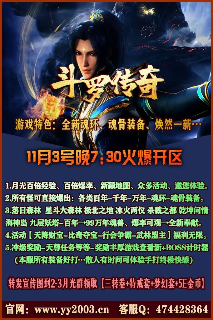 【斗罗月光◆全新奉献】11月3号晚7.30火爆开区【月光狂嗨--极品+10版】 ∷所有怪可爆出:各类十年.百年.万年魂环→魂骨→装备焕然一新→全新玩法∷ ∷地图划分:落日森林→星斗大森林→极北之地→冰火两仪眼→杀戮之都→乾坤问情→海神岛→九层妖塔…等等∷ ∷魂兽划 ...